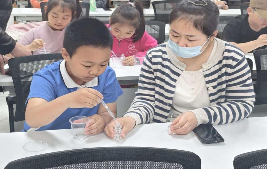 上午九点,活动拉开帷幕。在志愿者的引导与协助下,孩子们与家长一起合作,使用滴管将玫瑰花精油与专用乙醇进行科学调配,将调制的芬芳装入精美香水瓶中。随后,志愿者带领大家制作“绽放的山茶花”纸艺手工,当折叠的纸花在水中缓缓绽放时,现场响起了阵阵惊喜的欢笑声。