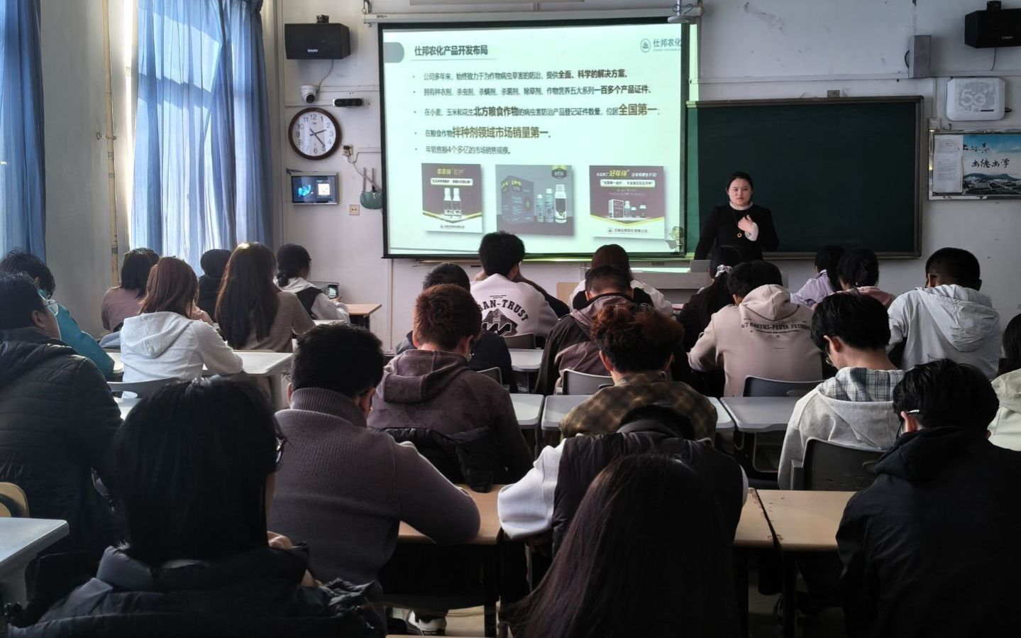 会上,山东仕邦农化有限公司张经理以专业的视角,深入剖析了企业的发展脉络、用人理念、业务布局及用人机制。她讲解到,山东仕邦农化有限公司致力于为员工打造卓越的职业发展平台,提供具有竞争力的薪酬和福利待遇。此外,张经理还结合具体案例,分享了企业内员工成长晋升的路径,介绍了针对新入职毕业生的系统培训计划和导师带教制度,鼓励毕业生积极投递简历,在仕邦农化的广阔舞台上施展才华。